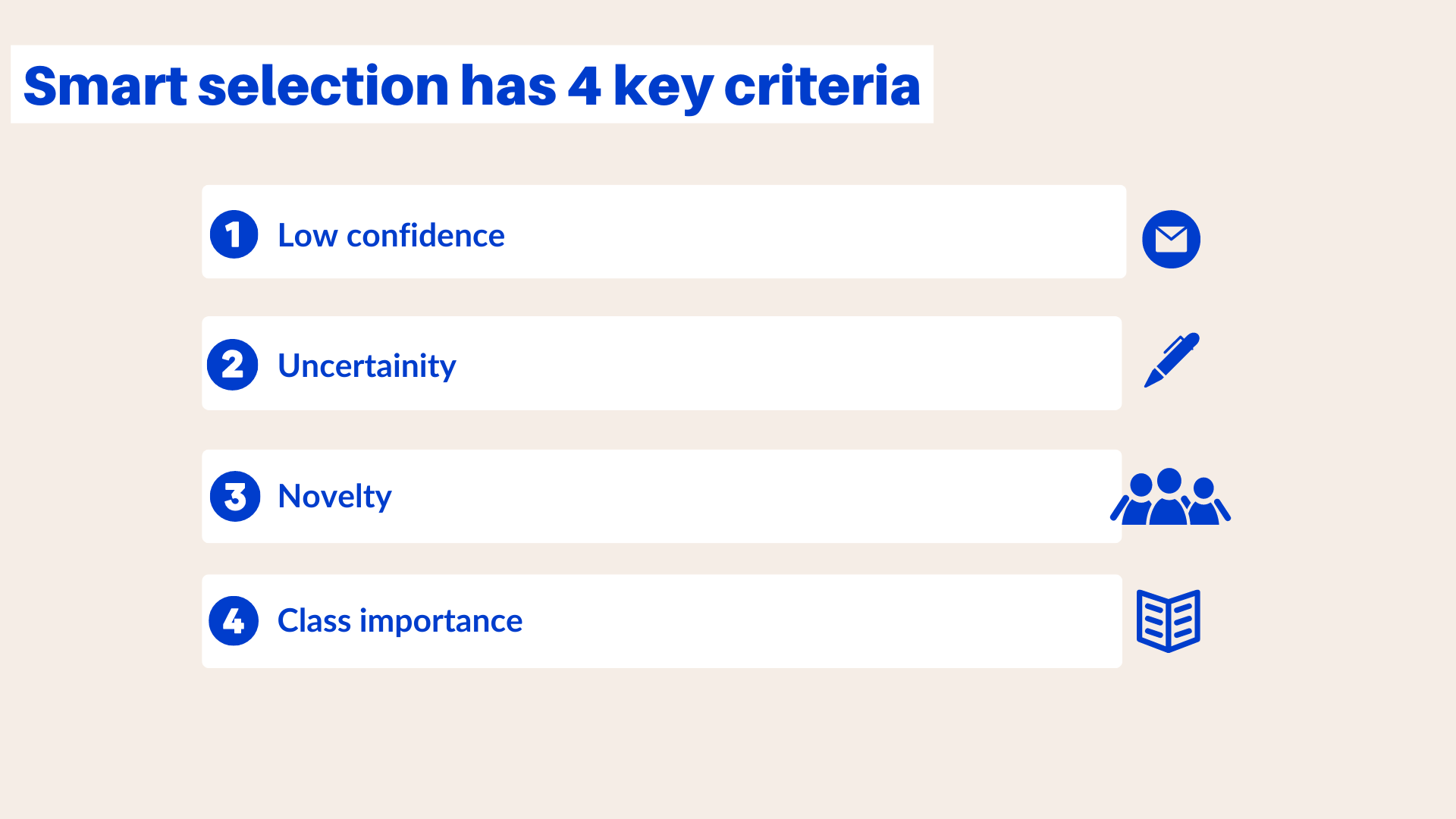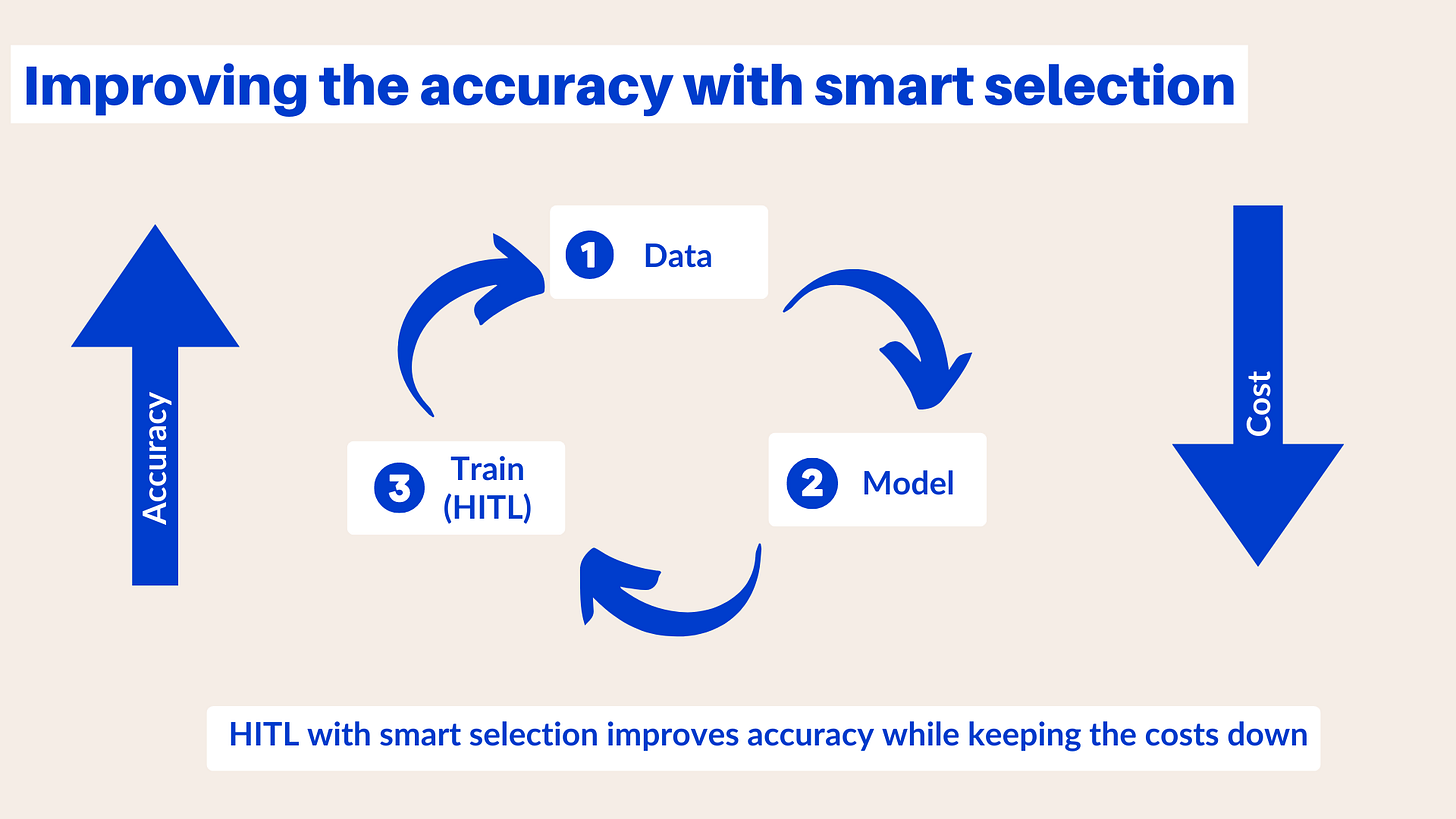One way to mitigate the disadvantages of HITL is through smart selection. To optimize performance without incurring high costs, it's important to recognise and let humans handle only the data and scenarios that will have the greatest impact on the model.