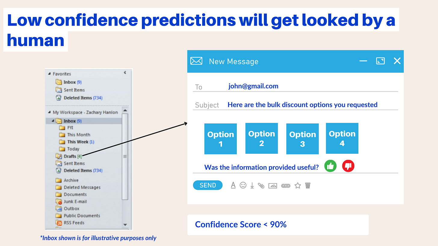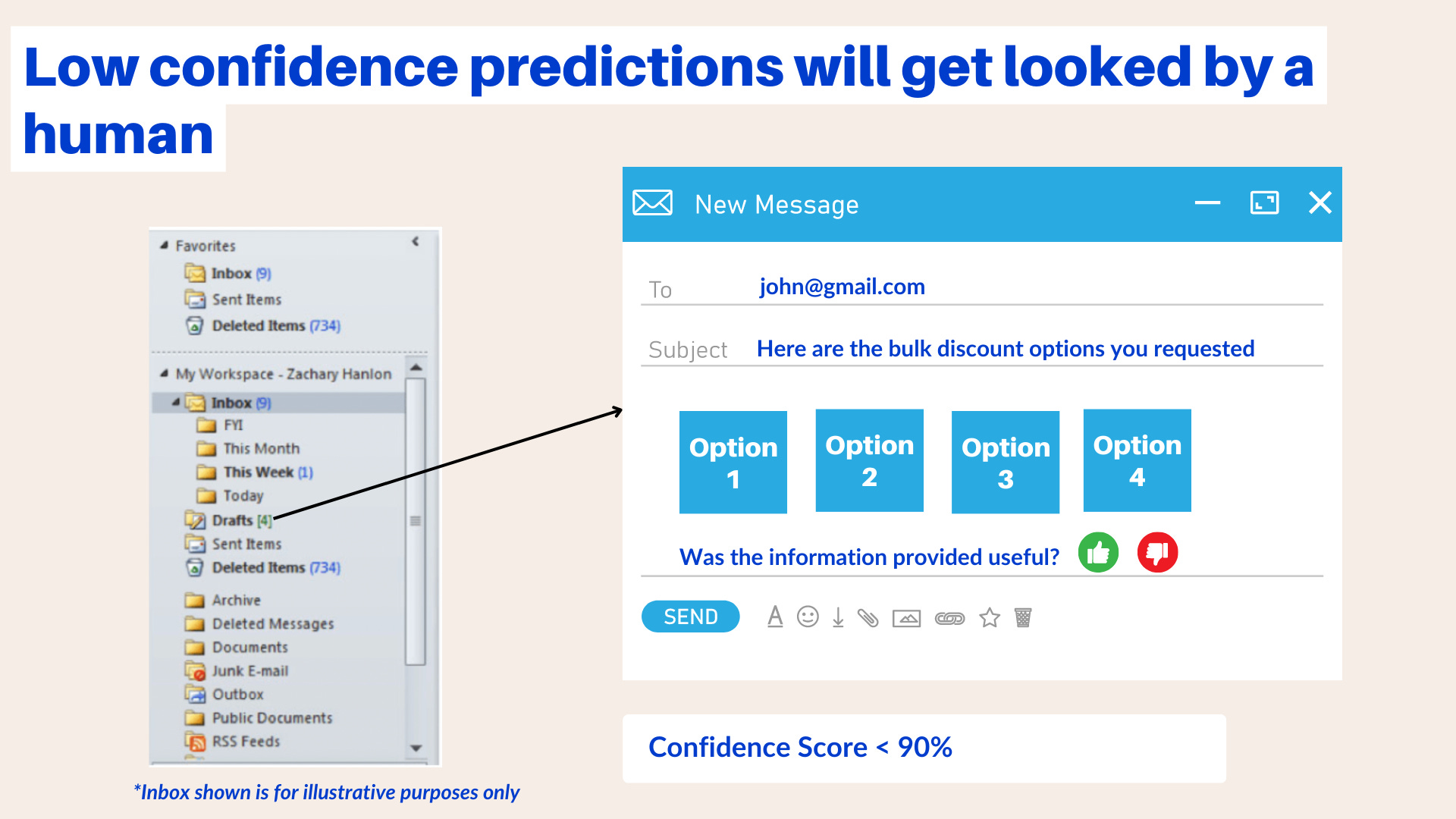 An example of this is illustrated in the informational query auto-responder we started building in our previous post. Our ultimate goal is for our ML model to categorize and answer all queries related to bulk discounts and international shipping. However, when we initially test and deploy our automation in production, it's possible for our model to encounter scenarios where it's not completely confident in its prediction. For instance, if we're working with a confidence score of 90%, and the model predicts an outcome with a confidence score of 80%, we can ensure that a human reviews it before releasing it. We can store the auto-response email to the customer in a draft folder, and a human can check it before hitting send, to avoid false positives.
