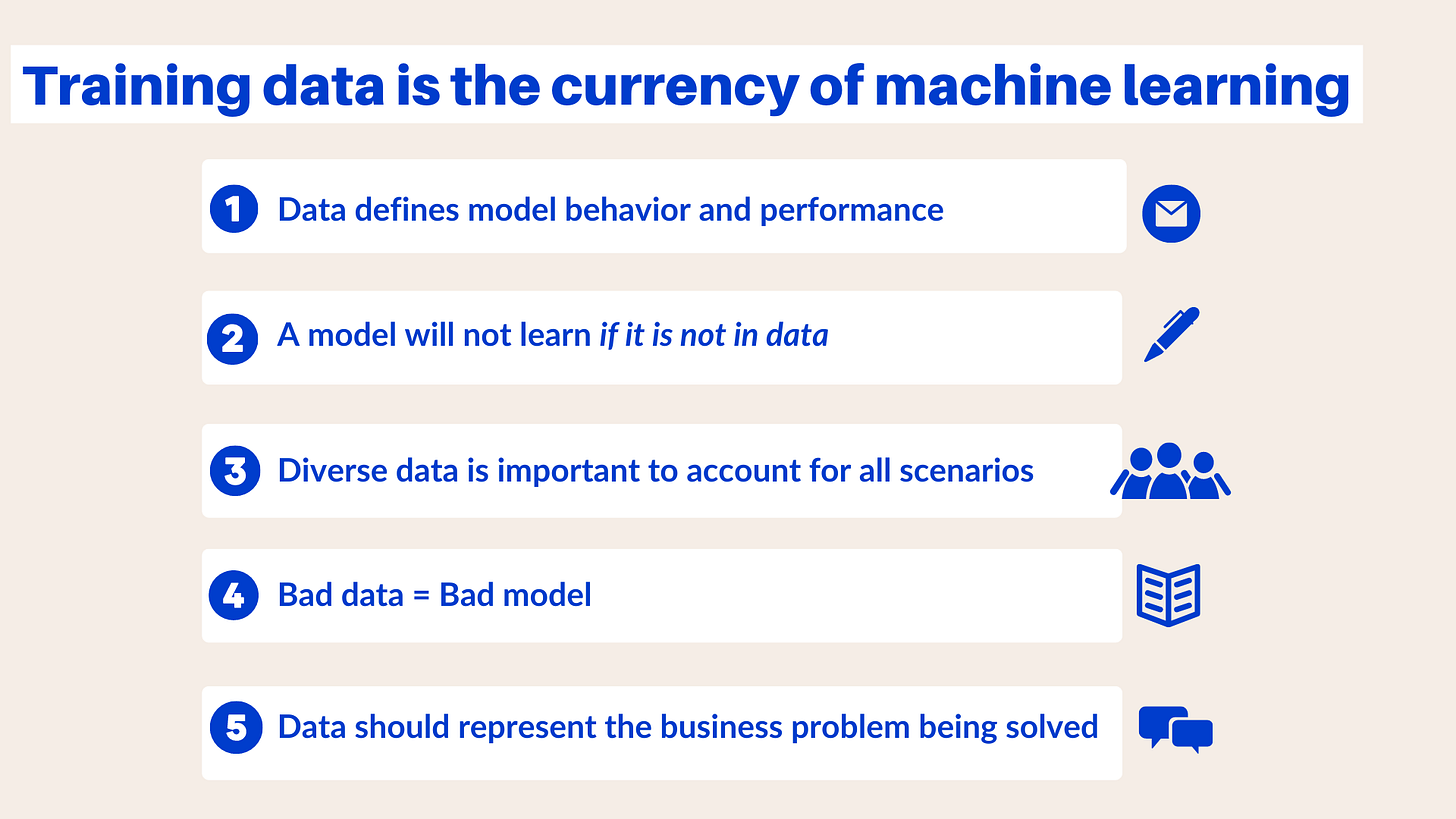 In Machine Learning, the data is key to the performance of your model and hence the outcomes of your product. if you want a model to learn a specific concept, it must be clearly represented in the data for the machine learning model to learn.