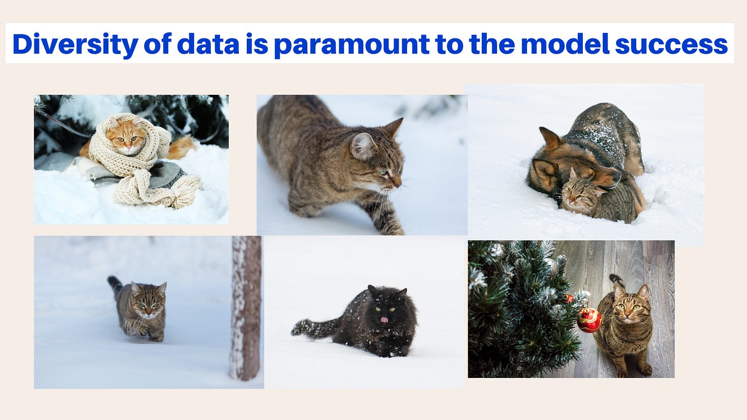 For example: if the model only encounters cats in the snow, then it is very unlikely it will identify a cat pictured inside the home.