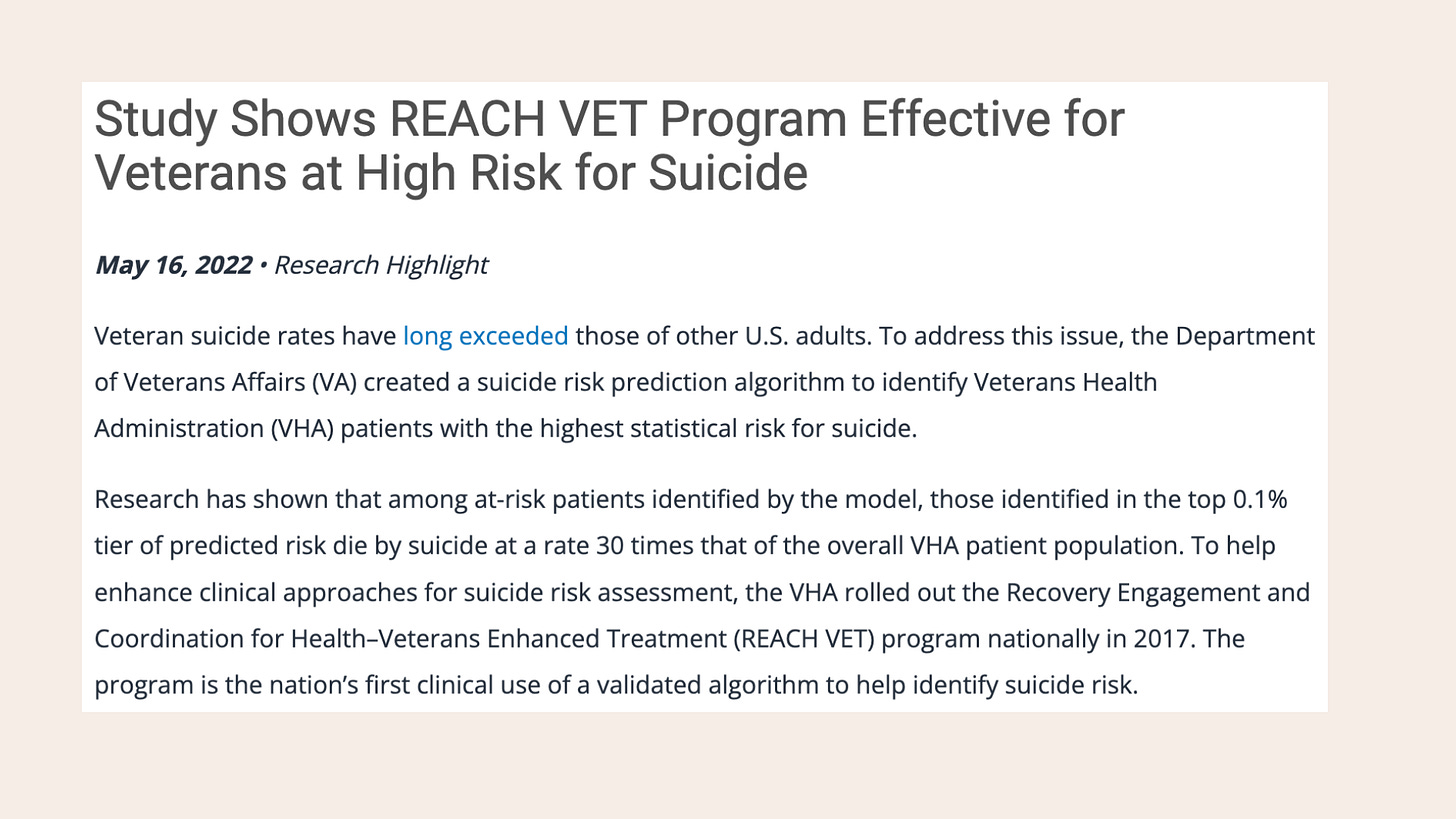 The US Department of Veterans Affairs has implemented the REACH VET program to reduce the number of veterans who commit suicide by using AI to predict when a veteran is at risk. The program's team created a model based on medical records, VA service usage, and medication information to determine the suicide risk of each tracked veteran. As the model includes sensitive medical information, it is crucial that these data remain secure. Therefore, the data collection must also comply with HIPAA regulations.